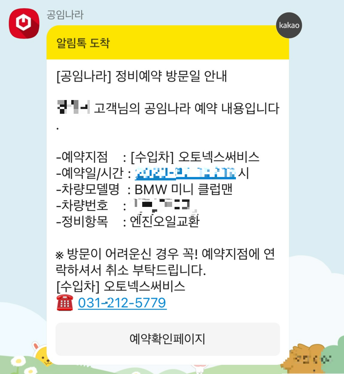 공임나라에서 정비 예약을 하고나니 카톡으로 알림이 왔어요.