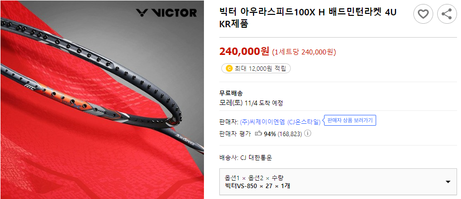 빅터 라켓 가격은 한국의 보상 판매가와 비슷해요.