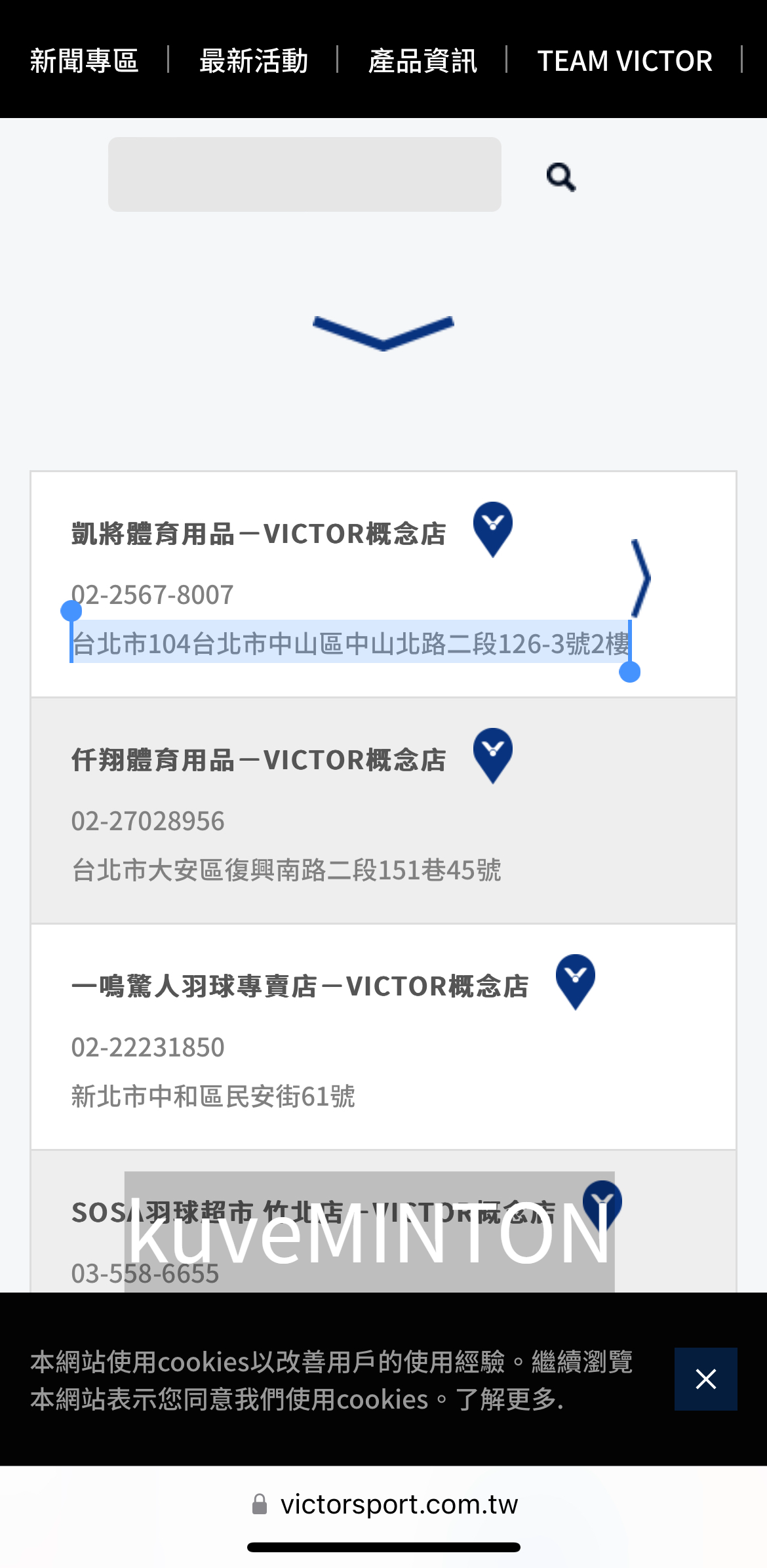** 대만 빅터 매장 주소를 중국어로 복사