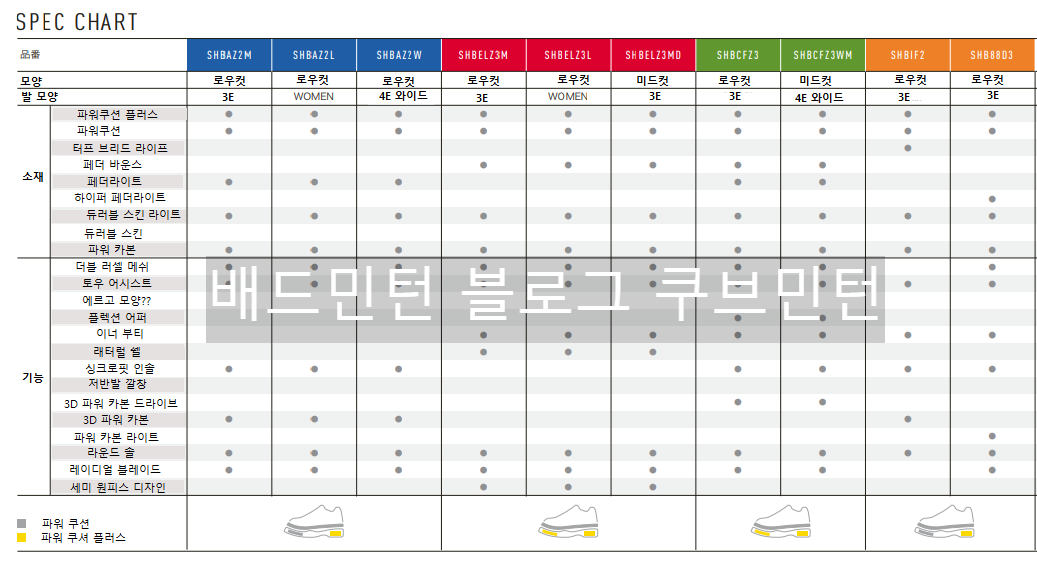 아래의 요넥스 배드민턴화 특성표와 같이