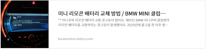 | 미니 리모콘 배터리 교체 방법 / BMW MINI 클럽맨 리모컨 배터리 교체 CR2032 다이소 배터리 (0) | 2023.12.22 |