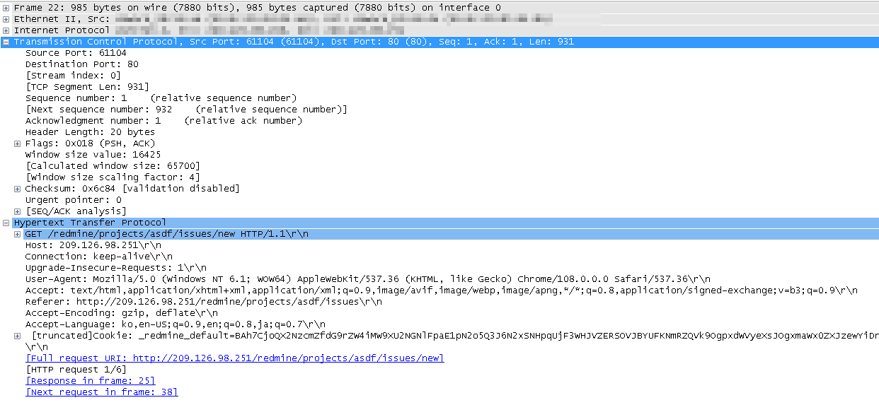 Connection을 맺을 때, TCP handshake 과정은 위의 그림과 같이 syn / syn+ack / ack / HTTP Get 의 순서로 진행된다.