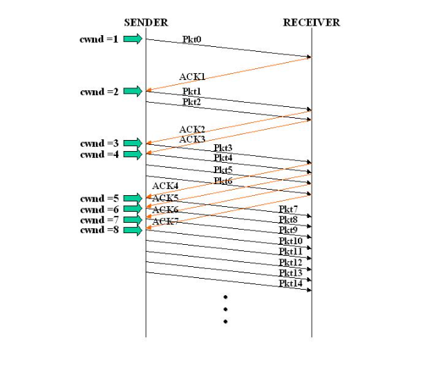 cwnd는 receiver의 ack에 +1을 하게되며, RTT(Round Trip Time)가 증가할 때마다 2배로 증가한다.