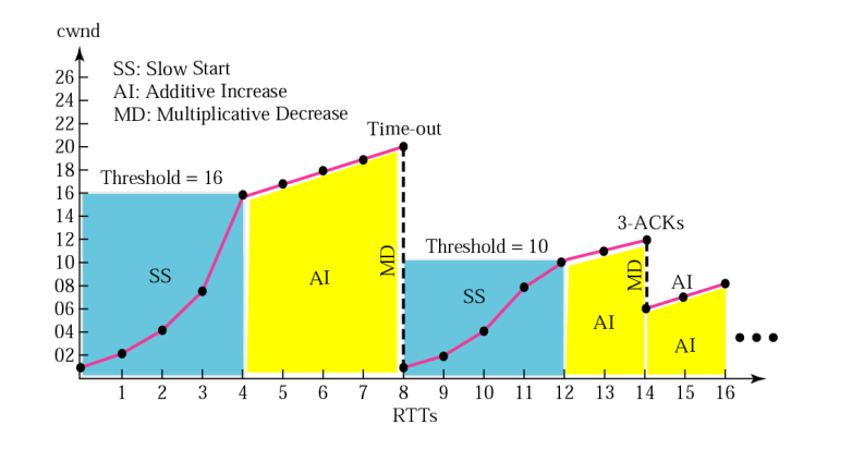 위 과정을 거쳐서 cwnd가 threshold에 도달하면 Additive Increase와 Multiplicative Decrease를 거치게 된다.