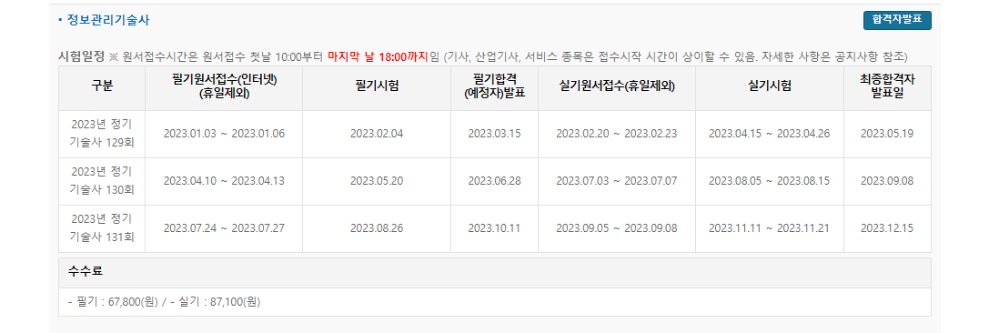 | 정보처리기사 시험 일정 / 시험 시간 / 시험 과목 정리 / 기출 문제 (2) | 2023.02.07 |