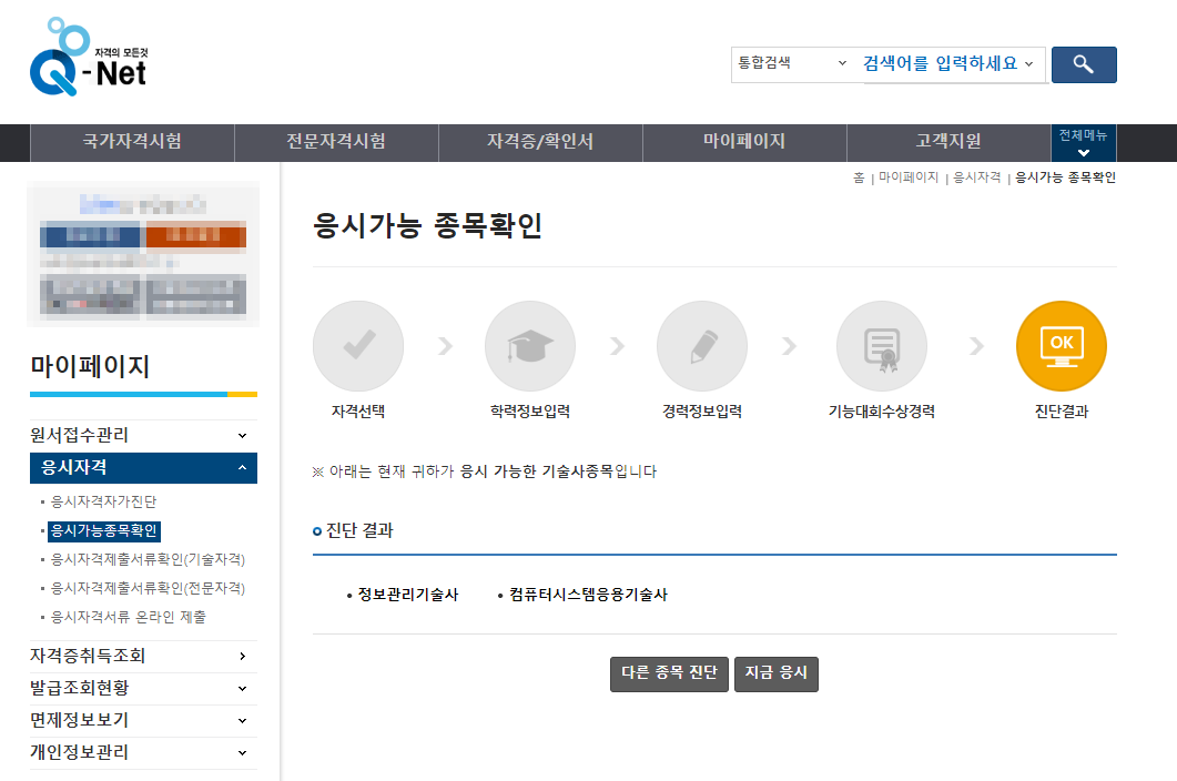 : 시험을 치룰수 있는 조건에 부합하면 아래와 같이 본인이 치룰수 있는 시험 과목이 출력됩니다.